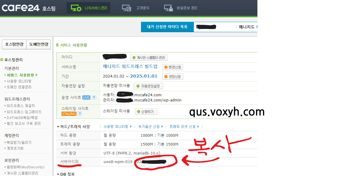 6. 서버 아이피를 찾는 방법은 아래의 그림과 같이 카페 24 관리자 페이지의 중간 부분에 있는 서버 아이피 주소를 복사해서 붙여 넣으면 됩니다.